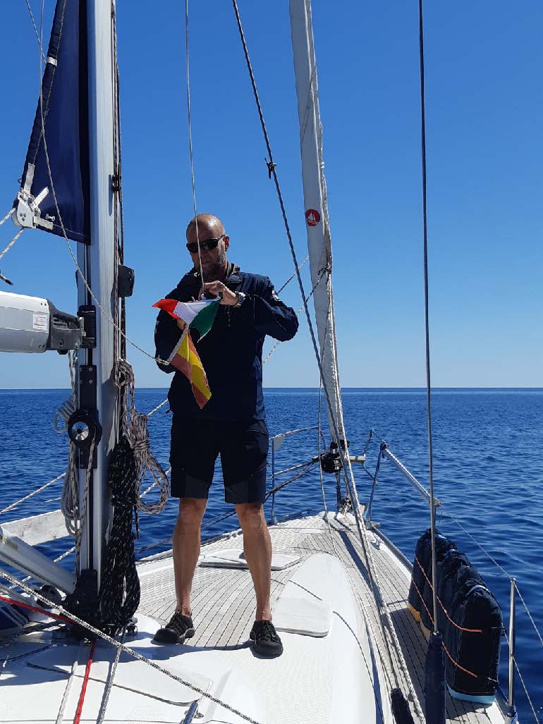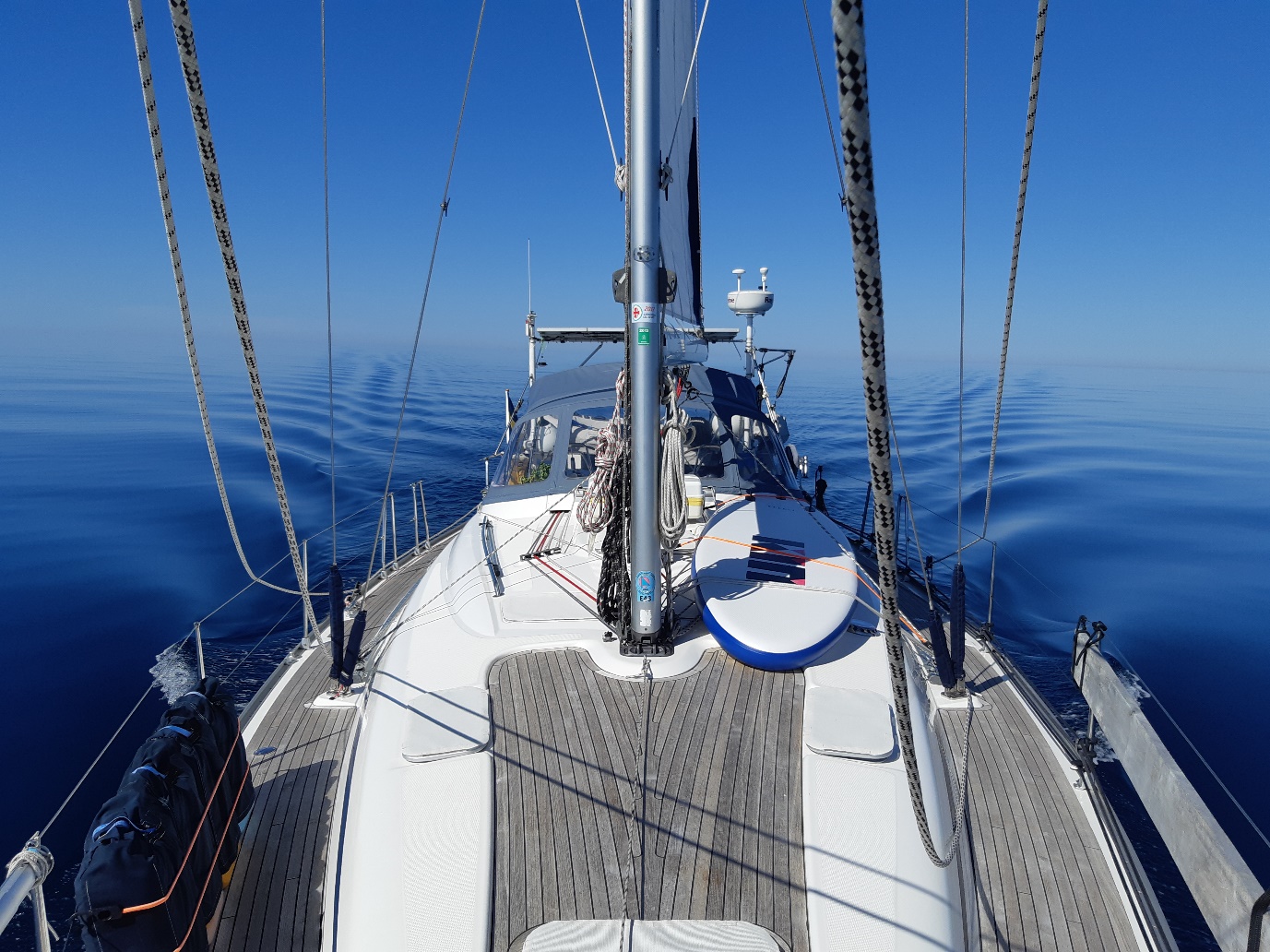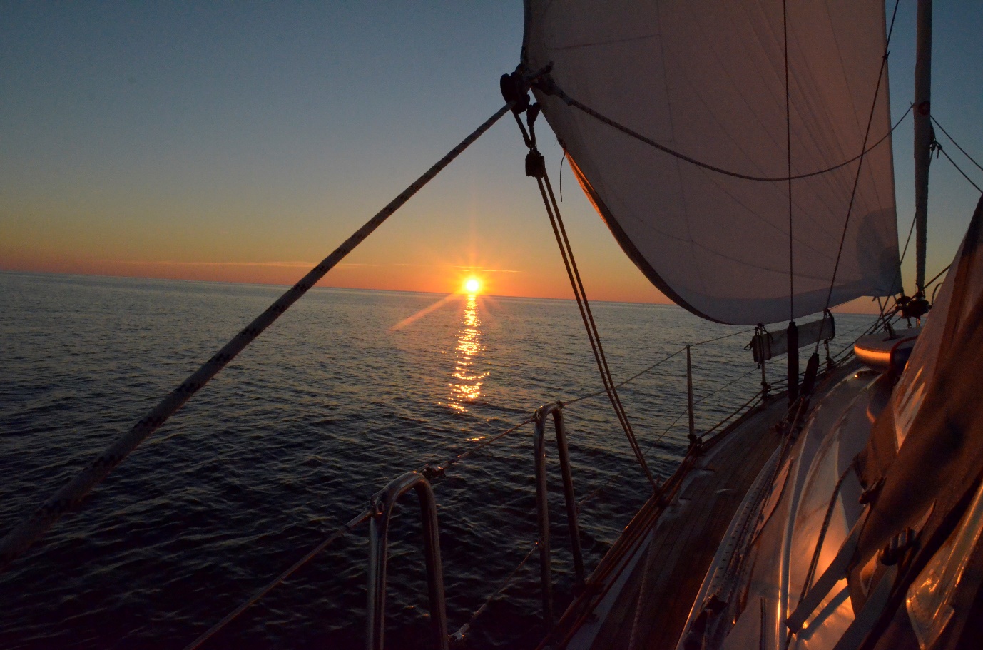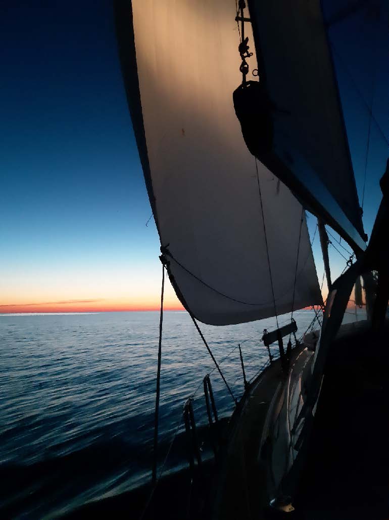 Det kändes som om vi var helt ensamma på havet. Det är en otrolig känsla att ha 360 grader obruten horisont. Allting kändes tryggt och bra. En bra väderprognos – platt vatten – lätt vind… och trots det gjorde vi god fart tack vare vårt älskade code-segel. Det var först på slutet vi fick ta hjälp av motorn.