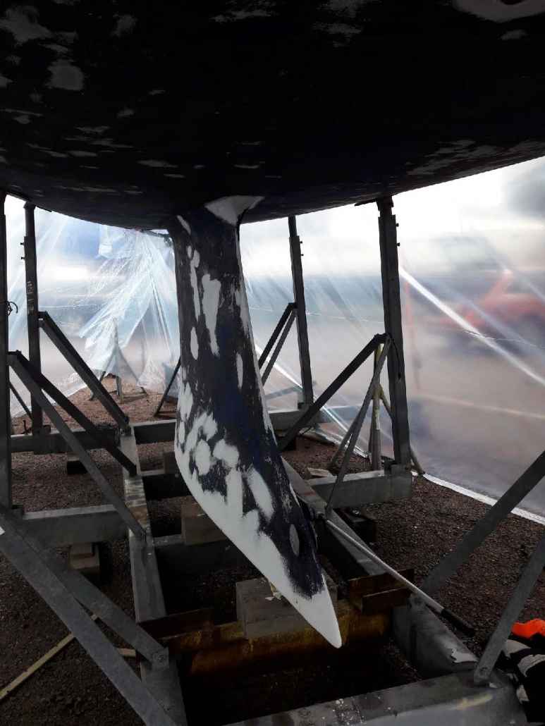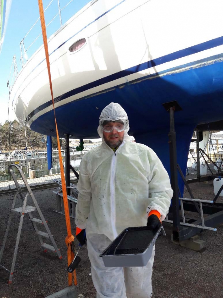 I år var det så jäkla kallt att vi blev tvungna att bygga ett tält runt båten och sätta in värmefläktar. På så sätt fick vi upp tempen till över 10 grader och lyckades bottenmåla i tid före sjösättning.