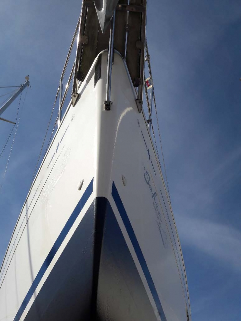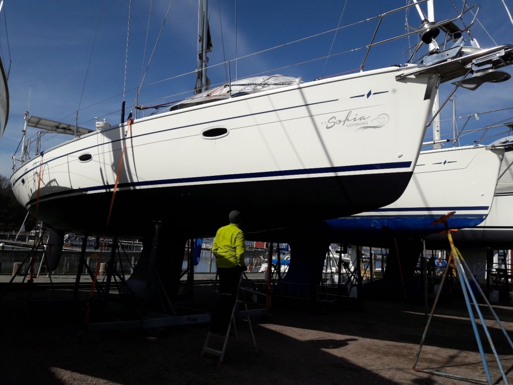 Denna gång har vi varit lite extra noggranna med botten. I höstas slipade vi bort nästan allt gammal färg ner till epoxigrunden, kölen rostbehandlades och spacklades och offeranod monterades på densamma. Efter dubbla lager ny färg är hon nu slätare och snabbare än någonsin.