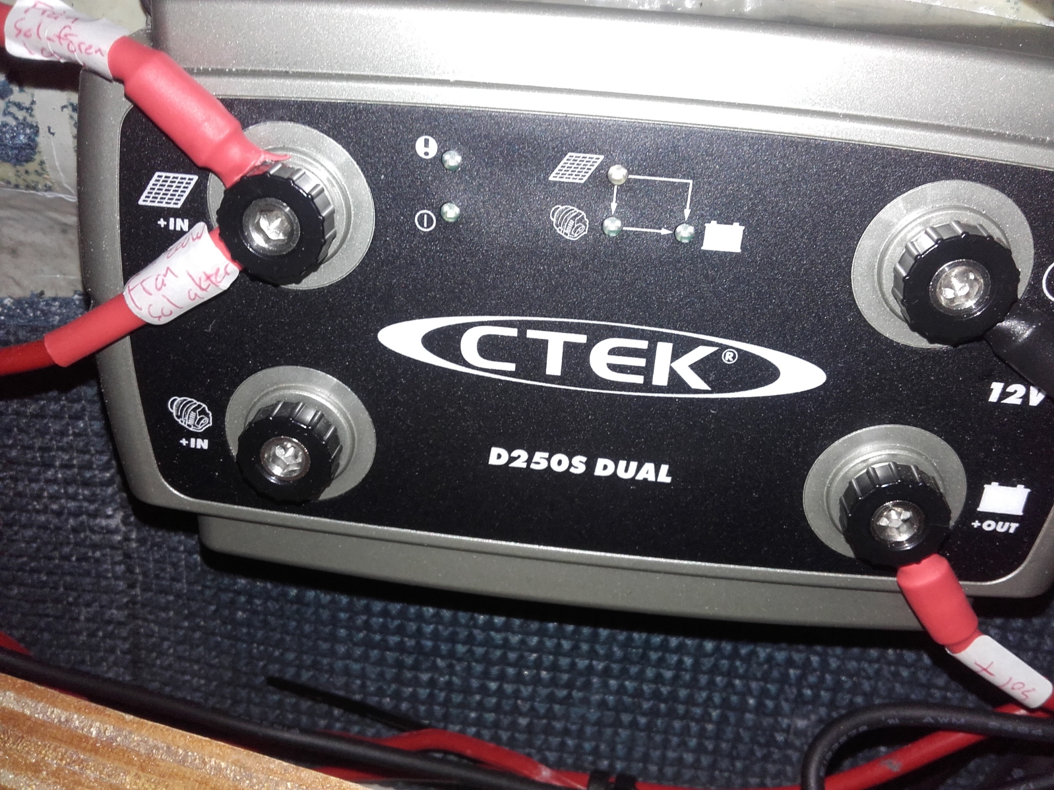 Vi valde att göra två åtgärder; dels skaffade vi en lös solpanel på 100 W som vi kan använda när vi ligger på svaj, dels installerade vi en Sterling laddregulator som reglerar laddningen från motorns ganska ointelligenta generator. Vi satte också in en CTEK 250 Dual regulator som tar hand om strömmen från både våra fasta solceller och den nya lösa solpanelen. Vill vi sedan komplettera med en vindsnurra kan även denna kopplas via CTEK-regulatorn.