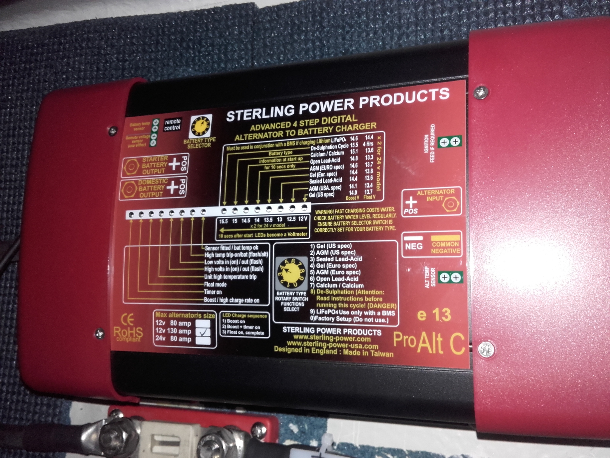 Sterling-regulatorn fungerar precis som en avancerad landströmsladdare vilket skall ge optimal och skonsam laddning till batterierna. Den gör att mer ström kan tryckas in på kortare tid och vid långvarig motorgång när batterierna är fulla går den ner på underhållsladdning anpassad för våra AGM batterier. (Ca 13,7 V vid 20 grader C)