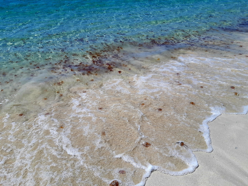 Vi tog oss iland med lilla dingen – och vandrade sedan i den vita sanden med blicken ut över det turkosa vattnet. Det var lite som att pulsa i snö – lite jobbigt faktiskt. Det ska finnas ”naturliga lerbad” på ön, men vi hittade dem inte. På kvällen åt vi middag ombord på sy Sofia och belönades med en vacker solnedgång.
