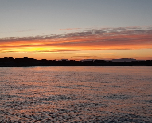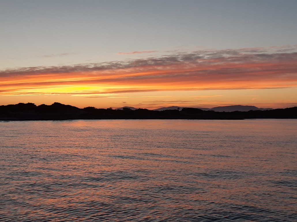 Vi startade 07:45 och gick först för motor i ca 1 timme. Efter det fick vi njuta av en alldeles perfekt segling. Lagom styrka – från rätt håll – lagom våghöjd och fantastisk soluppgång.