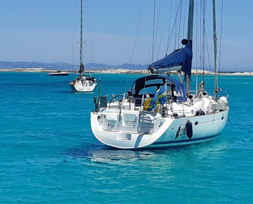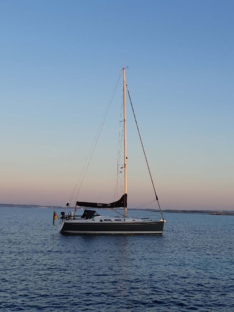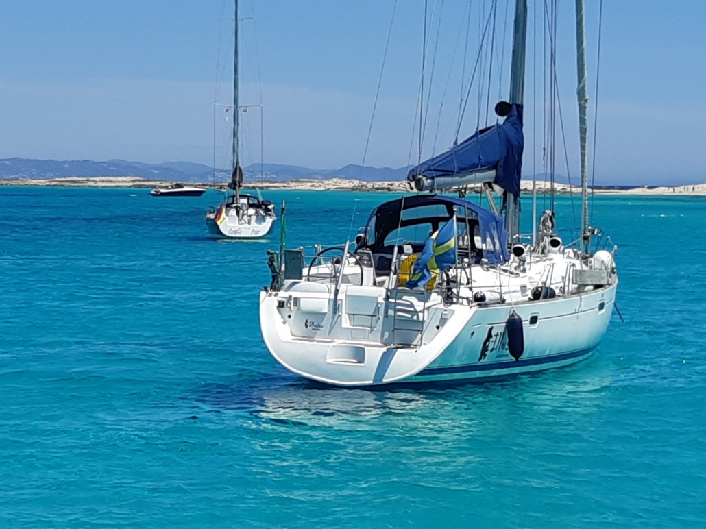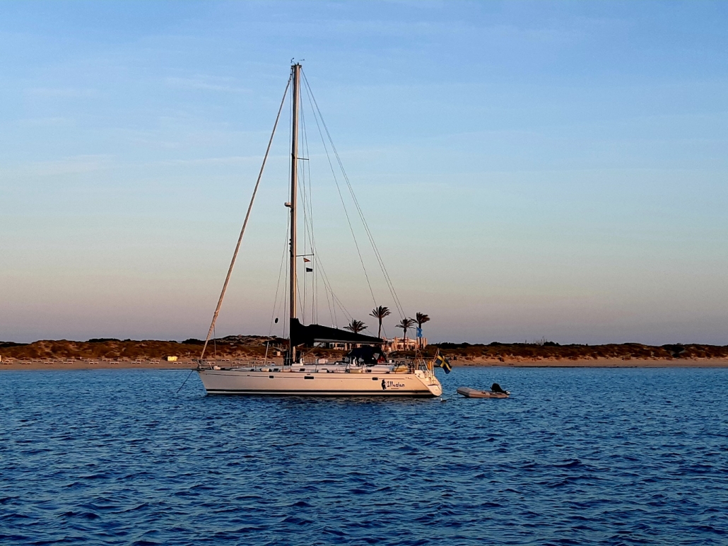 Illusion valde att lägga sig på västsidan. Formentera är en väldigt låg ö – så det är väl lämpligt för finväder ankring. När vi var där var det många badbåtar (som bara stannar för dagen) – och sen bara vi kvar till natten. Perfekt.