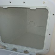 För att slippa byta gasolflaska så ofta ville vi ha minst en P5-flaska, gärna i komposit för viktens skull. Då det inte fanns någon lämplig plats för en sådan fick vi skapa en själva. Vi valde akterbänken på styrbord sida där det inte fanns något i vägen. Fick tag i lämplig lucka hos Hjertmans, och sedan var det bara att sätta sågen i plasten. Alltid lika nervöst…