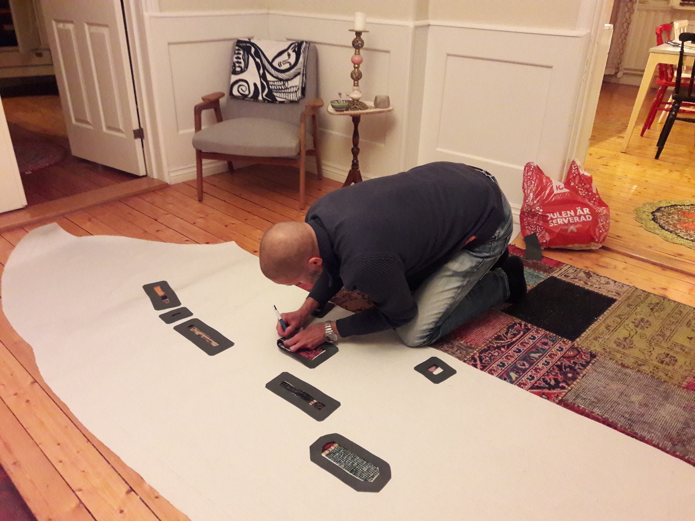 Denna fula hög tog vi med oss hem till Göteborg när vi var hemma för att fira jul. Tanken var att vi skulle sy hemma. Men när vi ritat och klippt ut alla delarna på tyget inser jag att vi måste ha möjlighet att prova på gummibåten före vi syr.
