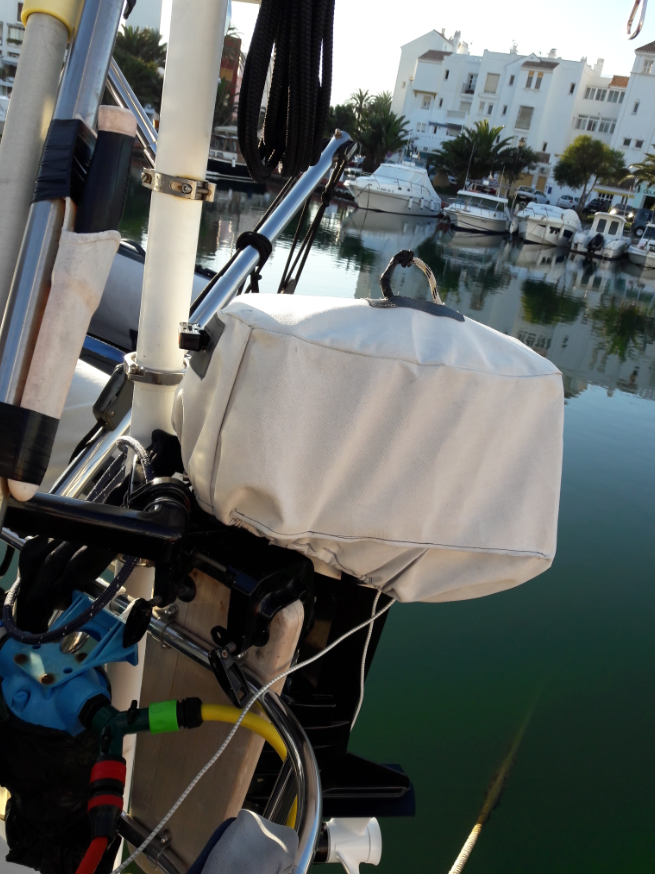 När vi nu ändå är igång och syr – och vi hade lite tyg över – så blev det dessutom ett nytt skydd till utombordaren.